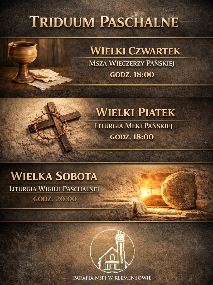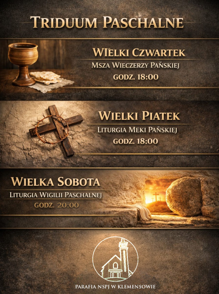 Triduum Paschalne (Jerzy Frankiewicz)1 kwietnia 20262 kwietnia 2026Nasza świątynia Zapraszamy na obchody Triduum Paschalnego w naszej parafii a także na drogę krzyżową w piątek o godz. 21.00